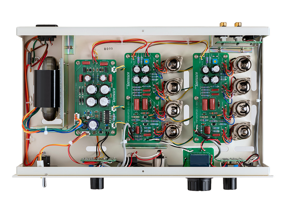 完成品仕様に加えて、CR取り付け済み基板と全真空管が付属するキット仕様が用意される点もTAP101HPの大きな特徴です。付属の基板は、回路ブロック間の配線やセレクターとボリュウムへの配線も完了した状態の「割基板(わりきばん)」で、分割してシャーシに取り付ける仕様。セレクターとボリュウム、真空管ソケットの取り付けや、ソケットと基板間の配線など、真空管アンプを「作る楽しみ」が手軽に味わえます。