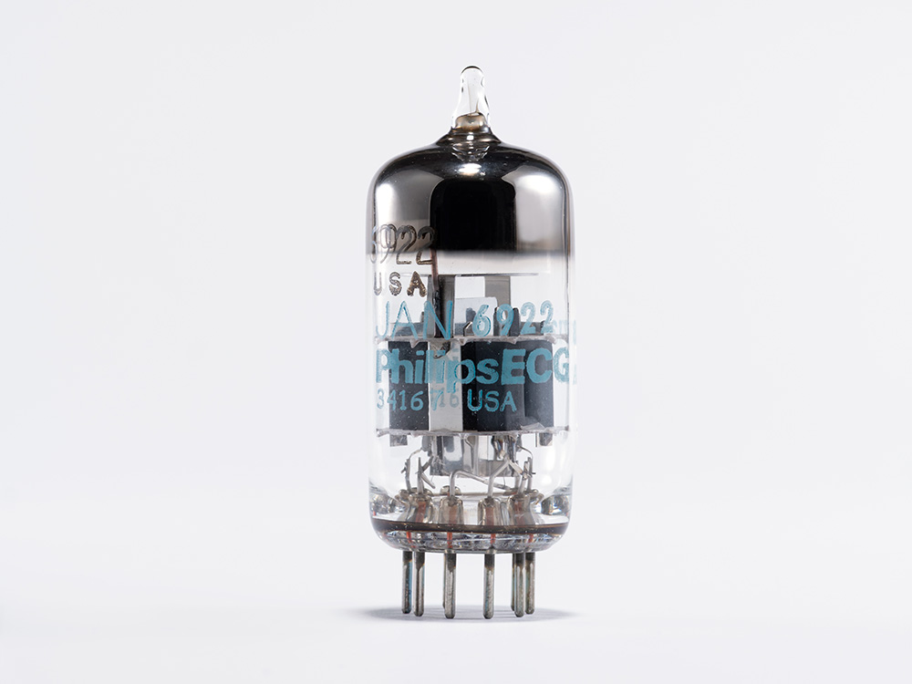 本機の出力管、フィリップスECG(Philips ECG)製6DJ8。6DJ8は高周波特性増幅用に開発され、半導体ハイブリッド構成アンプなどでも広く活躍する双3極MT管です。