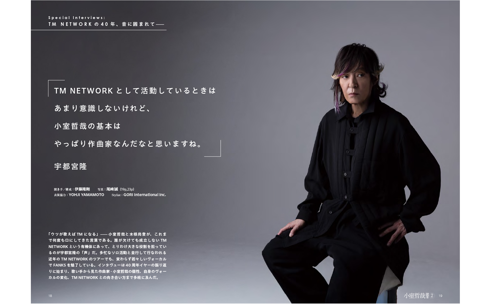 「ウツが歌えばTM になる」―― 小室哲哉と木根尚登が、これまで何度も口にしてきた言葉である。誰が欠けても成立しないTM NETWORKという有機体にあって、とりわけ大きな役割を担っているのが宇都宮隆の「声」だ。多忙なソロ活動と並行して行なわれる近年のTM NETWORKのツアーでも、変わらず若々しいヴォーカルでFANKSを魅了している。インタヴューは40周年イヤーの振り返りに始まり、歌い手から見た作曲家・小室哲哉の個性、自身のヴォーカルの変化、TM NETWORK との向き合い方まで多岐に及んだ。