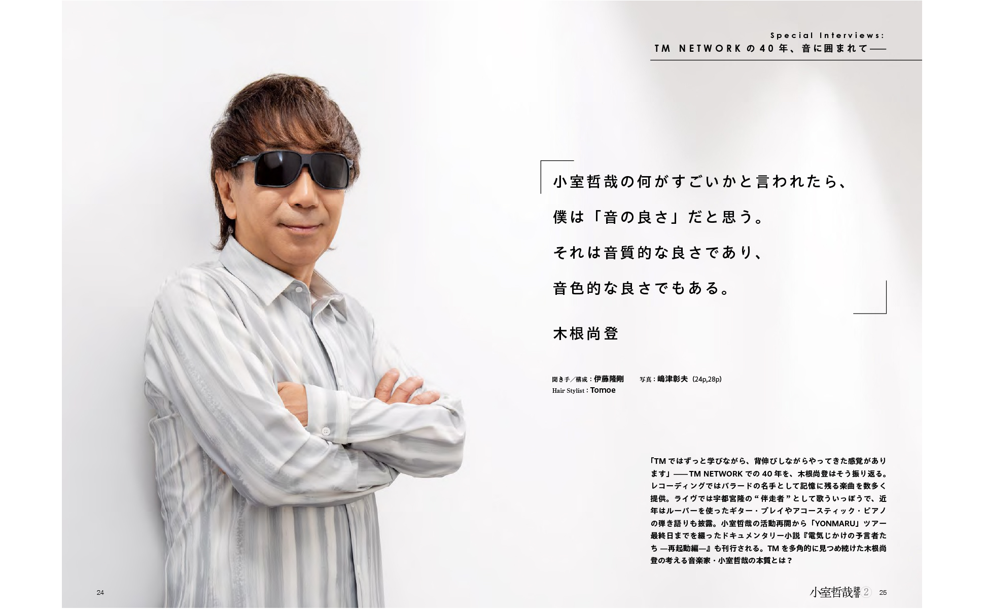 「TMではずっと学びながら、背伸びしながらやってきた感覚があります」―― TM NETWORKでの40年を、木根尚登はそう振り返る。レコーディングではバラードの名手として記憶に残る楽曲を数多く提供。ライヴでは宇都宮隆の“ 伴走者” として歌ういっぽうで、近年はルーパーを使ったギター・プレイやアコースティック・ピアノの弾き語りも披露。小室哲哉の活動再開から「YONMARU」ツアー最終日までを綴ったドキュメンタリー小説『電気じかけの予言者たち —再起動編—』も刊行される。TMを多角的に見つめ続けた木根尚登の考える音楽家・小室哲哉の本質とは?