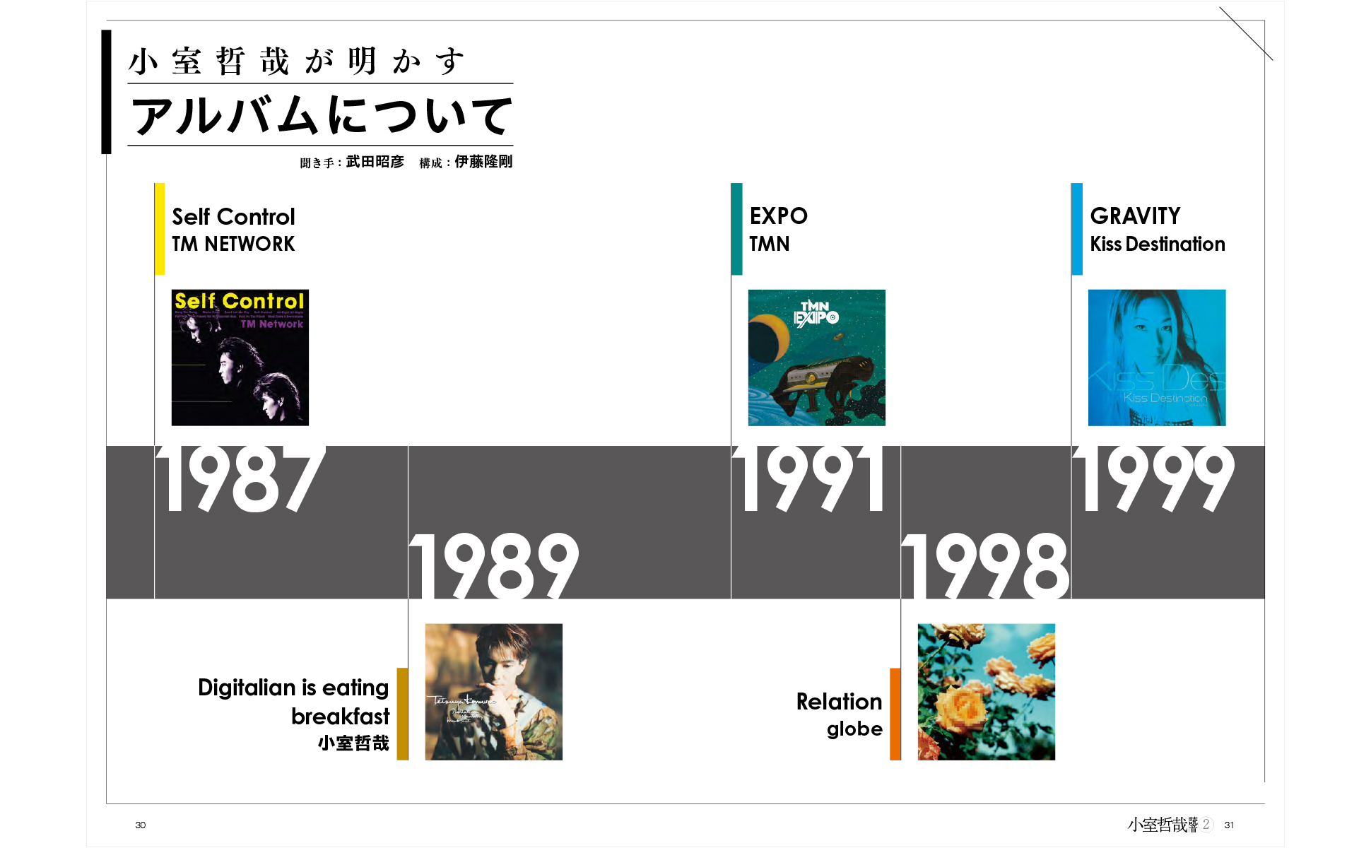昨年から続いていたTM NETWORKのデビュー40周年ツアー、新曲の発表、ドキュメンタリー映画の公開、本格的なエキシビションの開催と、2025年もその活動の勢いが増すばかりである、音楽家/プロデューサーの小室哲哉。その小室哲哉が自身の思い入れの深いアルバムをクローズアップするムックの第二弾『小室哲哉 読音2』では、TM NETWORK『Self Control』(1987)、初のソロアルバム『Digitalian is eating breakfast』(1989)、TMN『EXPO』(1991)、globe『Relation』(1998)、Kiss Destination『GRAVITY』(1999)という、5枚のアルバムについて、本人自らがじっくりと、そして深く語りおろしています。