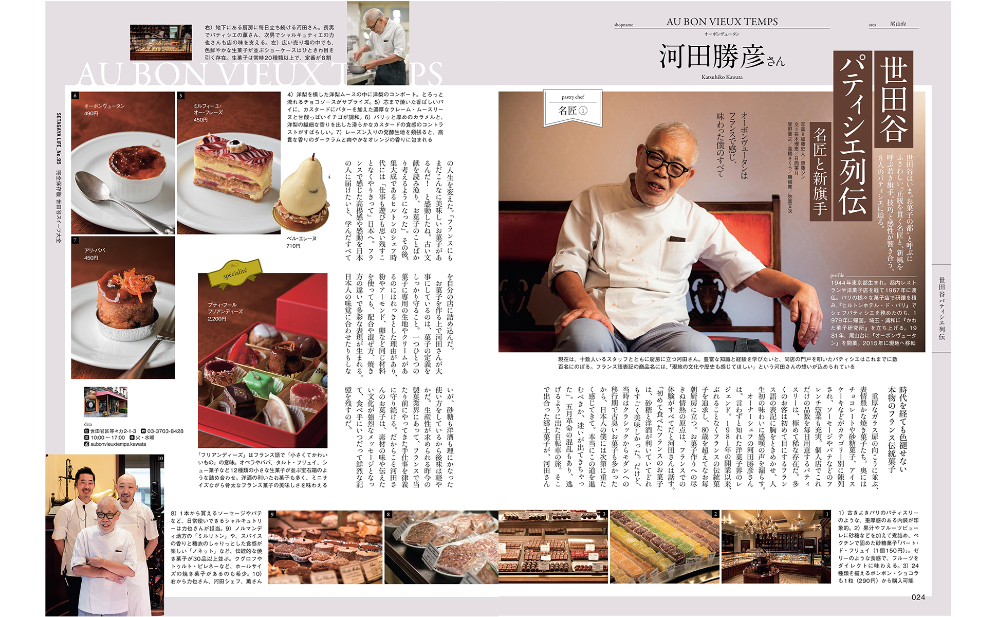 特集の幕開けは「世田谷パティシエ列伝」から。いま世田谷は、お菓子の都と呼ぶにふさわしい街。正統派を貫く名匠と、新風を巻き起こす若き旗手が同居し、それぞれが独自の世界を築いています。