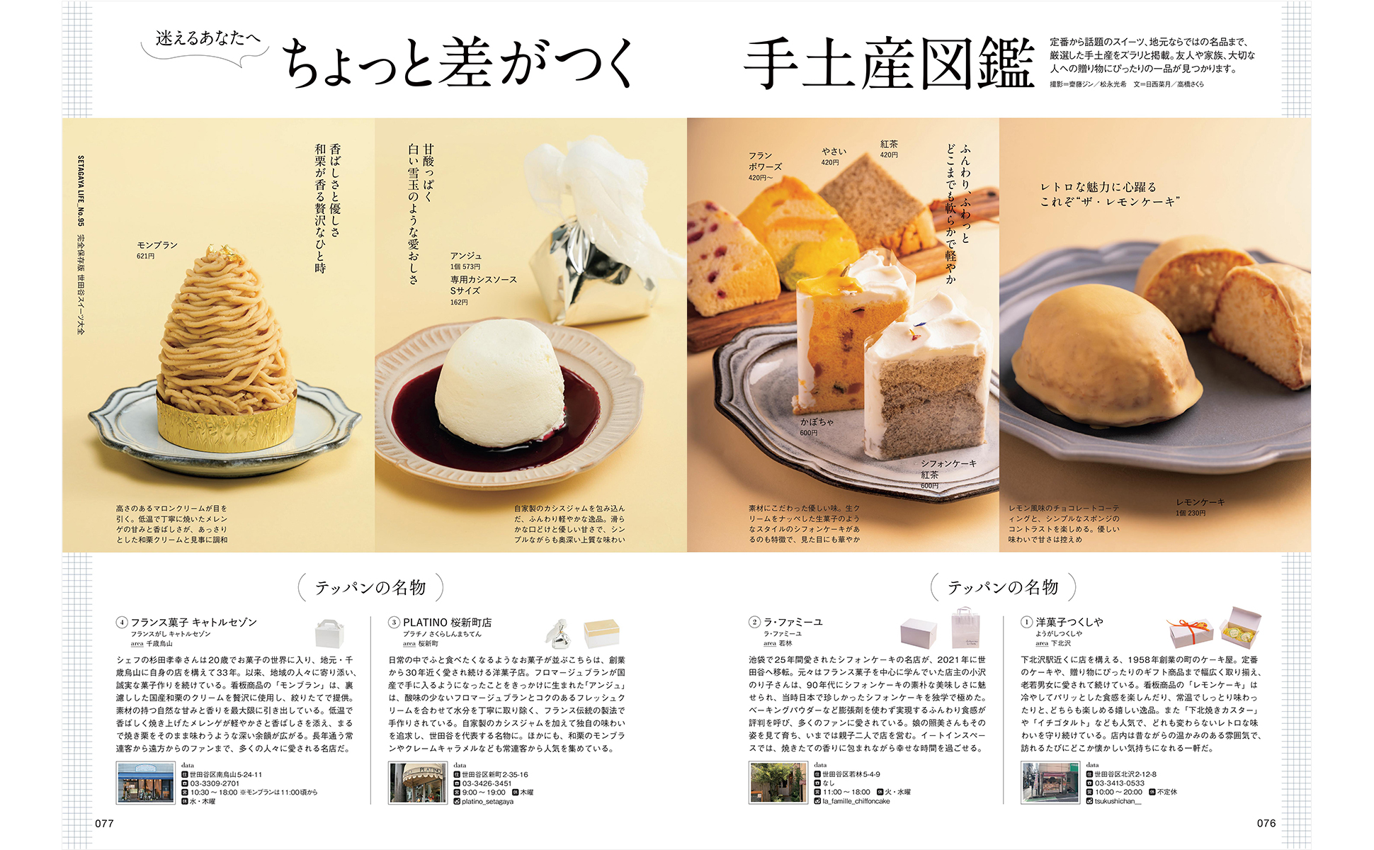 さらにさらに、特集の最後は、“もう迷わない!世田谷で手土産を選ぶならここ”という店を一挙紹介。この街のスイーツは、食べ尽くせないほどに広がり、どれも驚くほどレベルが高いのです。