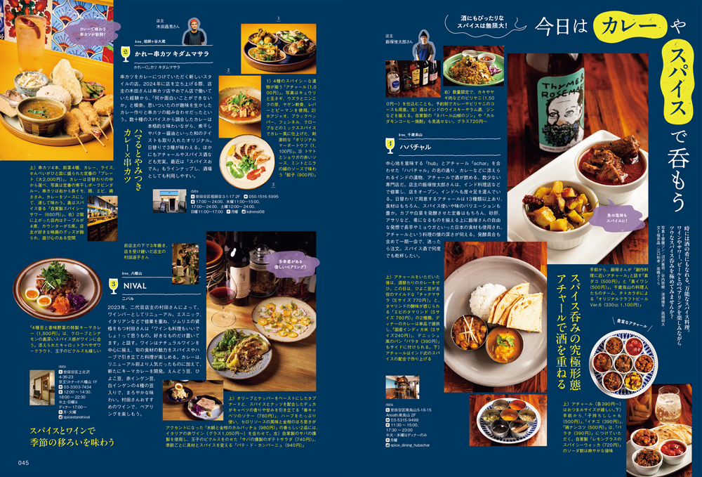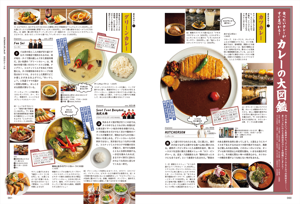 また、インドやスリランカ、タイ、ネパールなど、世田谷で味わえる本格アジアカレーを巡りながら、インド定食「ミールス」の魅力にも入門。スパイス料理をつまみにお酒を楽しむスパイス呑みや、飲んだ後の〆にぴったりの酒場・バーのカレーも紹介します。ラーメンやうどんといった麺料理、町中華や焼肉店、蕎麦屋で提供されるカレーなど、通好みのひと皿にもフォーカス。そして最後に、具材やスタイルごとに広がるカレーの世界をずらっと図鑑にまとめました。この街のカレーは、食べ尽くせないほどに広がり、どれも驚くほどレベルが高い!